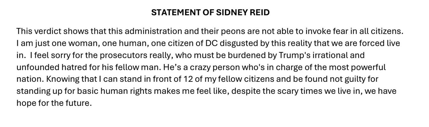 So yes, everything is awful. But we did see another example last week of the guardrails that still stand in Trump’s way as he attempts to corrupt the criminal justice system. On Thursday a D.C. federal jury found Sidney Reid not guilty of a misdemeanor charge of assaulting, resisting, or impeding a federal officer. It took the jury only two hours to reach a verdict following a three day trial.
